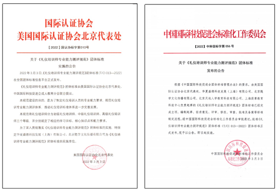 《礼仪培训师专业能力测评规范》团体标准由美国国际认证协会北京代表处、中国国际科技促进会成人教育分会联合提出。