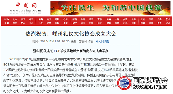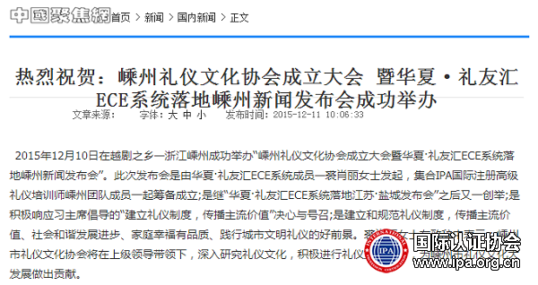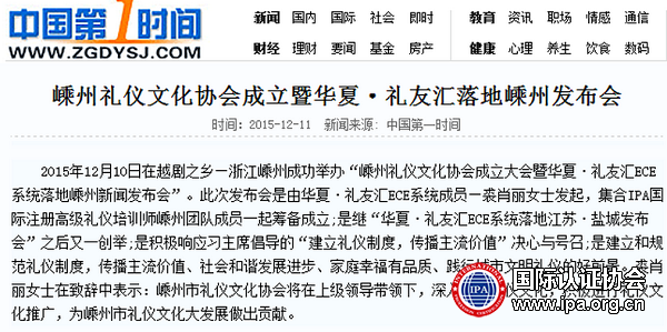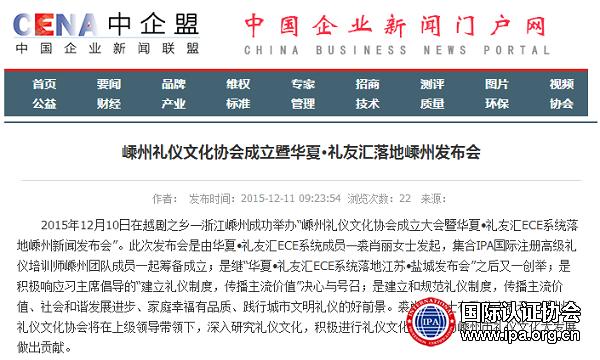 2015年12月10日在浙江嵊州成功举办“IPA国际礼仪(职业)素养人才培训基地”授牌仪式,同时嵊州礼仪文化协会成立大会暨华夏·礼友汇ECE系统落地嵊州新闻发布会圆满举办。此次授牌由IPA礼仪认证总顾问导师---郭品禾先生与新任嵊州礼仪文化协会会长、华夏·礼友汇ECE系统成员-裘肖丽女士共同揭牌并发表致辞。