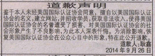 鉴于本人未经美国国际认证协会同意,擅自以美国国际认证协会的名义,建立网站,并招收学员,获取非法收入,使得美国国际认证协会形象产生了不良影响,为此本人深表忏悔。为消除影响,恢复美国国际认证协会在公众心目中的形象,特在此公开道歉。